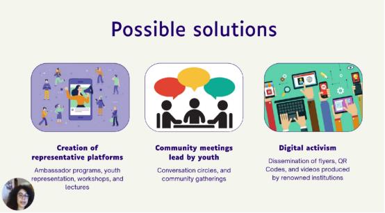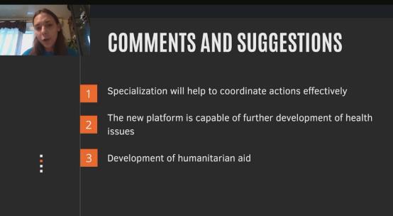 通过“世界咖啡屋”环节,选手与评委们深入探讨疫情防控与社会复苏的可行方案,碰撞思维火花。来自罗马尼亚的选手约内斯库代表团队向评委介绍方案,他别出心裁地采用了动画来展示想法和创意,炫酷的画面生动地阐释了疫情治理中的全球经济和国际合作疾病检测情况。