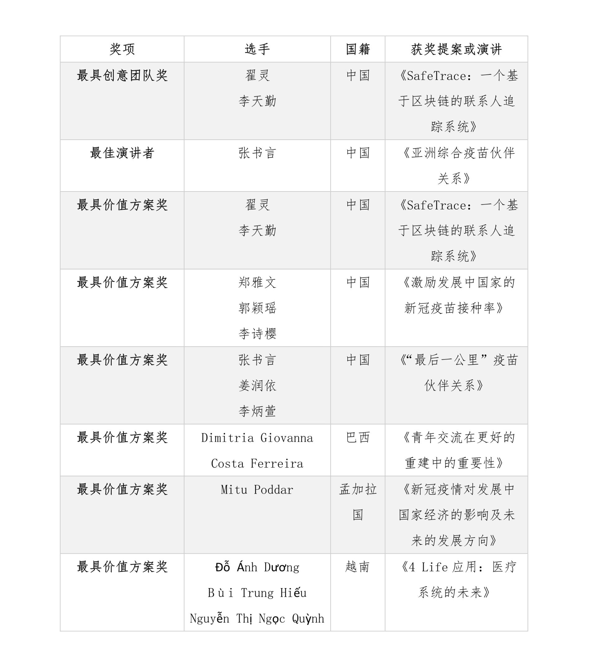 经过激烈角逐,来自中国的翟灵和李天勤团队获得“最具创意团队奖(MIT)”;来自中国的张书言获得 “最佳演讲者(Ignite Talk King/Queen)”荣誉;来自4个国家的6个团队提出的方案荣获“最具价值方案奖(Most Valuable Project)”。