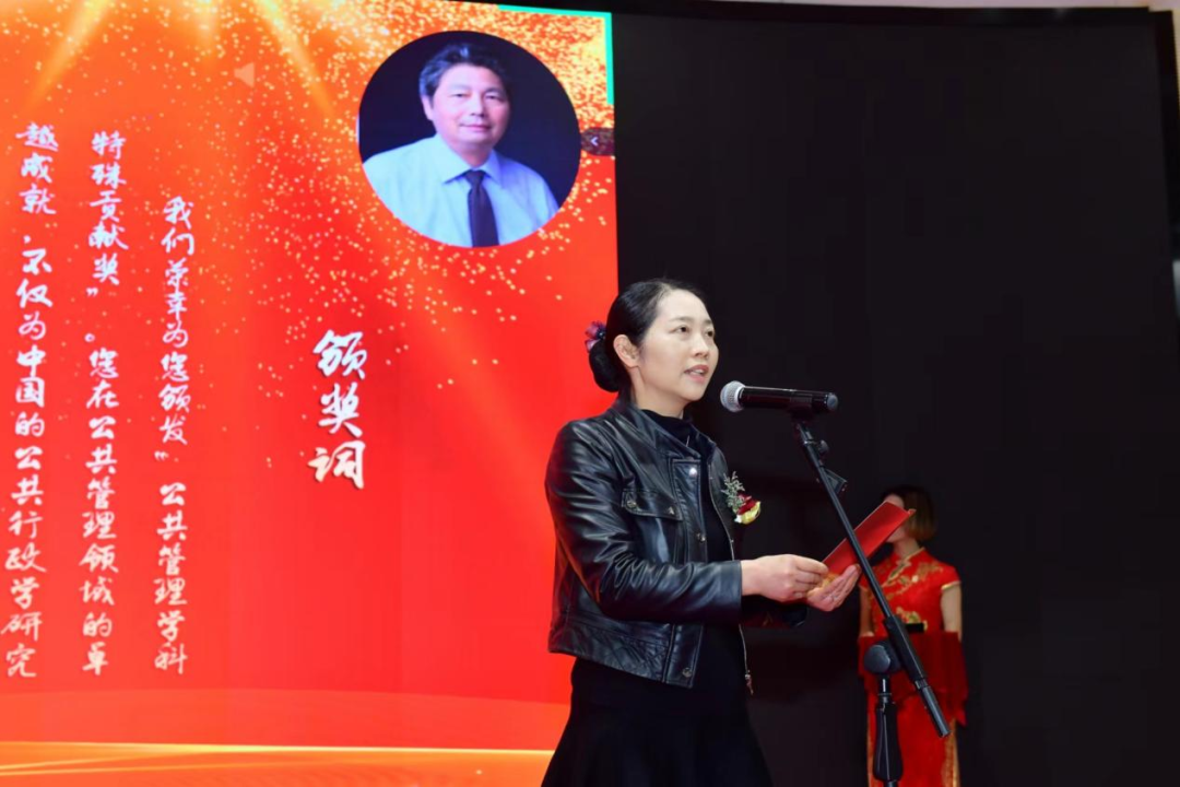 我们荣幸为您颁发公共管理学科特殊贡献奖。您在公共管理领域的卓越成就,不仅为中国的公共行政学研究奠定了坚实的基础,也为全球学术界作出了重要贡献。您在著名学术期刊上发表的文章为公共管理领域带来了新的理论和实践视角。您的著作如《公共行政的改革、创新与现代化》、《官僚政治》等,已成为公共管理领域的经典。您的研究领域覆盖了公共管理理论、比较公共行政以及组织及人力资源管理,这些多元化的研究方向体现了您对公共管理学科的深刻理解和不懈探索。作为教育家,您在复旦大学培育了无数优秀的公共管理学者和实践者。今天,我们向您表示最崇高的敬意,感谢您对公共管理学科的杰出贡献和持续奉献。您的学术成就和教育理念将继续激励后来者,为中国的公共管理发展做出更大贡献!
