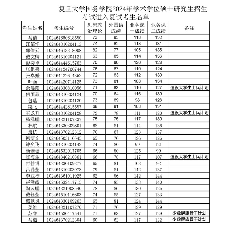 复旦大学bet365体育 2024年学术学位硕士研究生招生考试进入复试考生名单