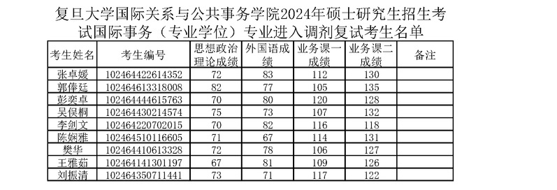 复旦大学bet365体育 2024年硕士研究生招生考试国际事务(专业学位)专业进入调剂复试考生名单
