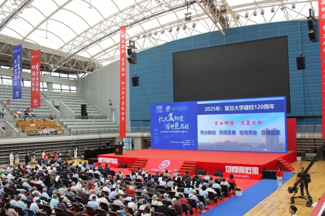 合影结束后,院友们落座正大体育馆内场。上午9时,“忆久复相逢,百廿旦启程——2024复旦大学校友返校日主题大会”准时开幕。