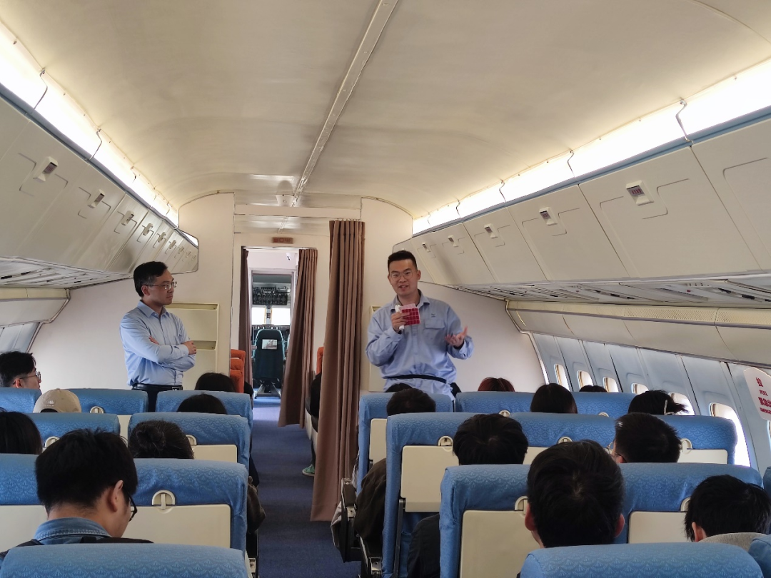 活动伊始,在汪仕凯老师和商飞讲解员老师的介绍中,同学们了解到中国商飞的企业沿革、核心产品阵容及未来战略规划。通过讲解员的生动叙述,同学们对中国商飞从ARJ21支线飞机到C919大型客机的研发征途获得了更为直观的理解,深切感受到技术创新背后的智慧积累与辛勤努力。尤为引人注目的是,讲解员透露,我国首架自主研发的客机787项目仅完成了“两架半”,因成本高昂等因素遗憾停产,而同学们所坐的正是这珍贵的“两架半”之一。尽管未能再次翱翔天际,但这架飞机以讲述自身故事的方式,在年轻学子心中延续了其航空使命,展现了中国民航业特有的情怀——飞机不仅是交通工具,更是中国民航发展历程的见证者与伙伴,即便退役,亦能以教育和启发的角色发光发热。
