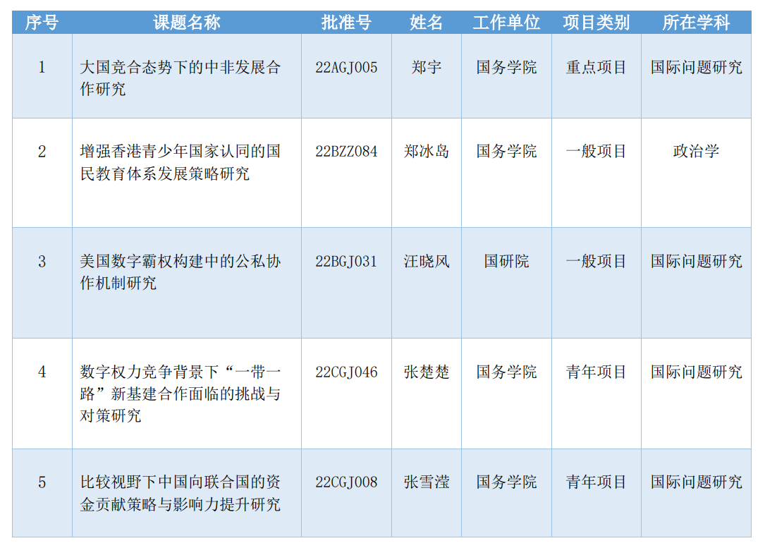 2022年国家社科基金年度项目和青年项目按照规定程序,顺利完成评审立项工作并向社会公布。复旦大学政治学高峰学科有5项科研项目入选,包括1项重点项目、2项一般项目、2项青年项目,具体情况如下: