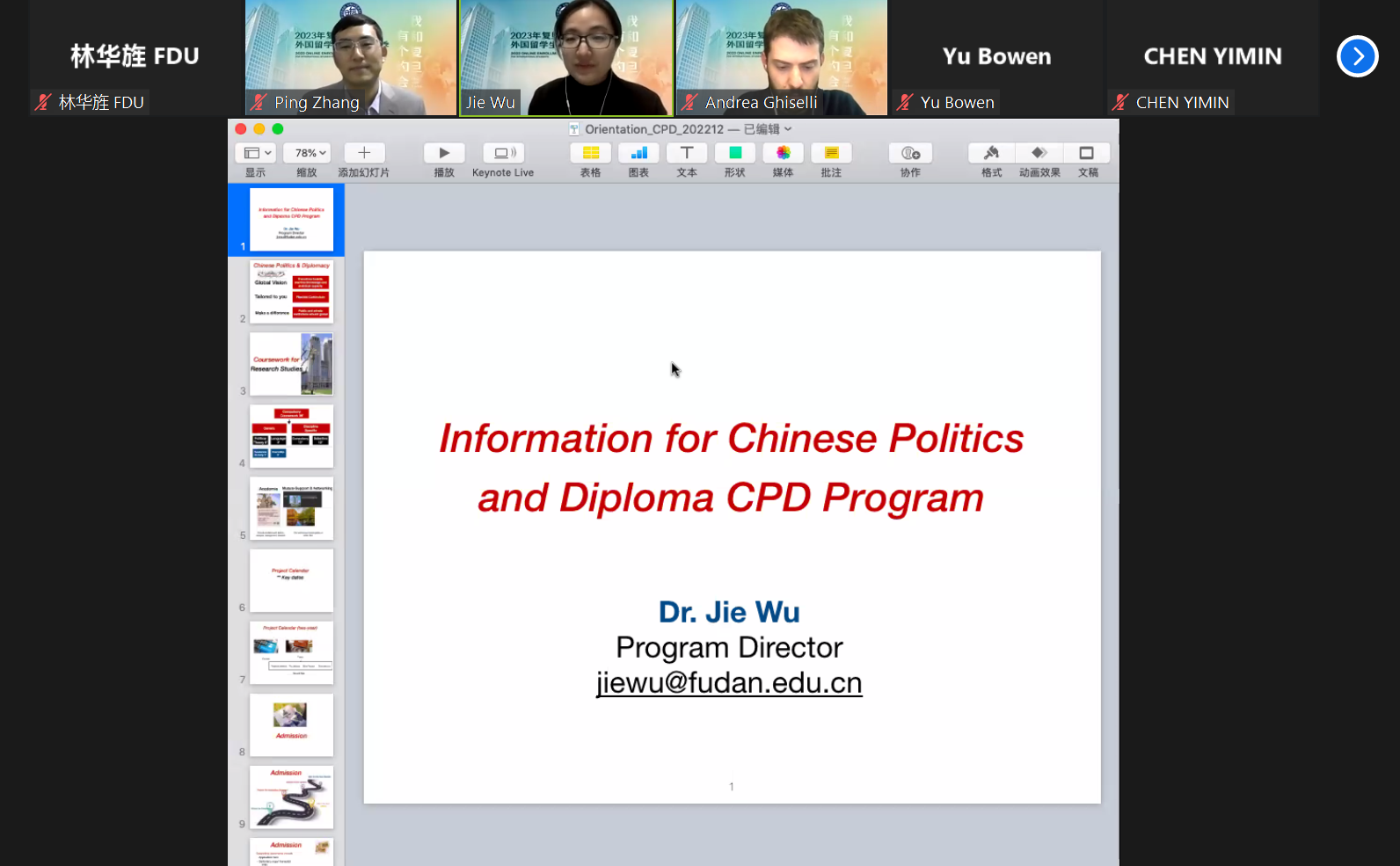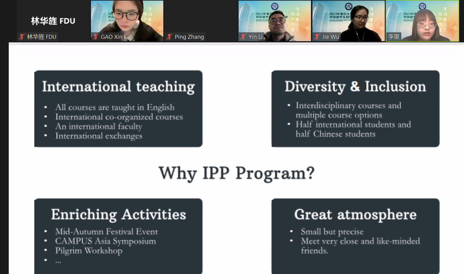 吴洁讲师介绍了中国政治与外交项目的课程设计和申请流程,指出项目不仅有助于提高留学生的分析、管理和研究能力,还能他们的拓展国际视野,并使他们在有趣的课外生活中感受学在复旦的乐趣。