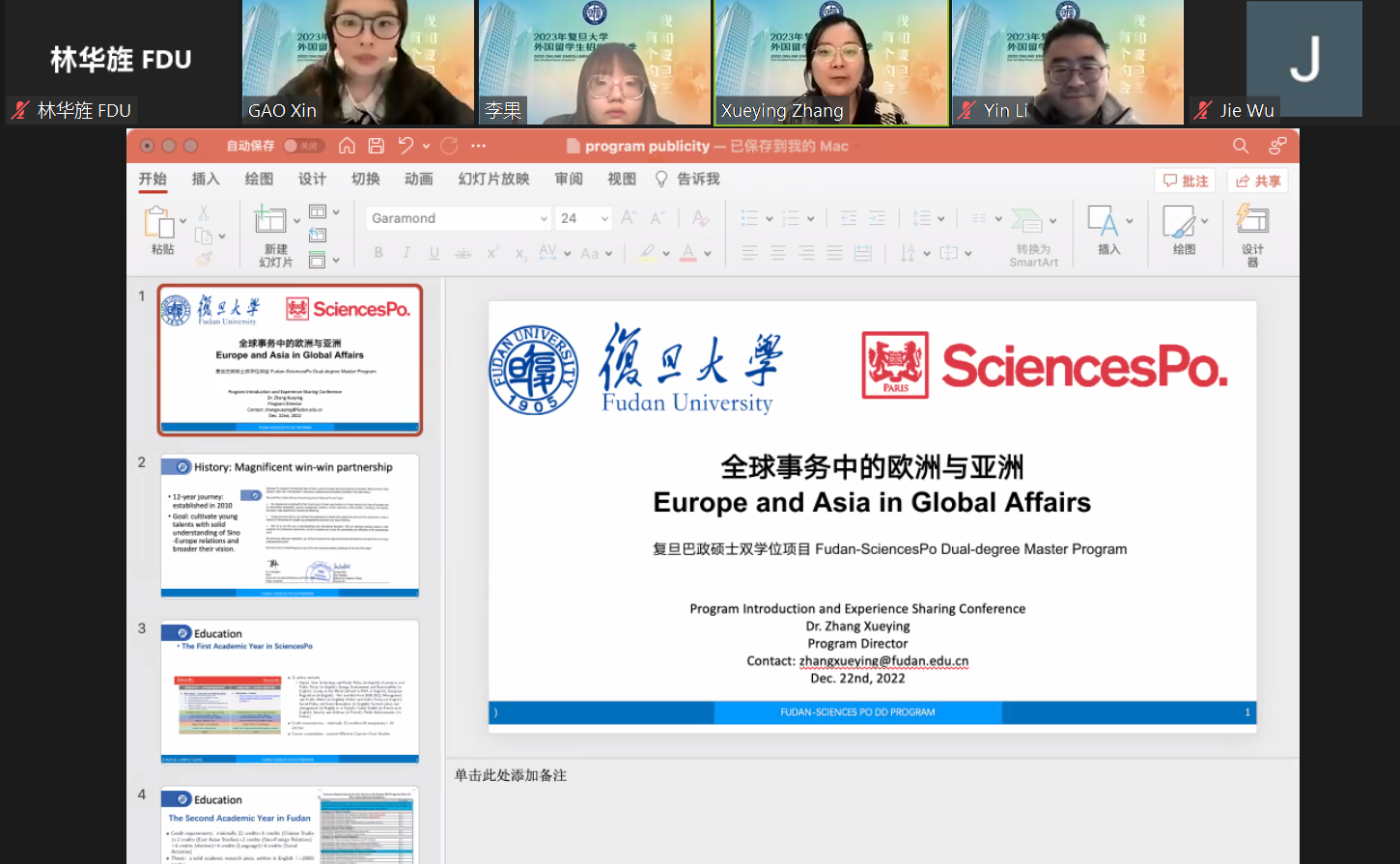 张亚宁青年副研究员结合个人学习经历对复旦-巴政双学位项目进行了生动有趣的补充说明。通过项目学习,中外学生不仅可以同时学习到对亚洲和欧洲更为独到的见解,也有机会在两所世界顶尖高校享受丰富多彩的学习生活。
