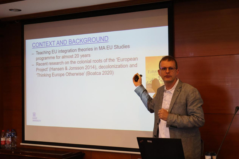 6月5日,由bet365体育-bet365中文版app 和复旦大学中欧学术交流基金共同主办的“复旦大学欧洲研究学术讲座系列”第一讲在bet365体育 拉开帷幕。来自比利时根特大学的Jan Orbie教授围绕“另一个欧洲?对早期欧洲一体化理论的多元化及去殖民化尝试”进行主题讲座。讲座由bet365体育 张亚宁青年副研究员主持。