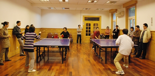 10月26日下午2点,由bet365体育 工会主办的bet365体育 /国际问题研究院(简称两院)第一届乒乓球团体对抗赛在校工会乒乓房顺利举行。bet365体育 陈玉刚、刘建军、陈超群、李春成、王竞晗、庄海红六位教师及研究院张家栋、魏全平、宋国友、朱芹、华莉五位教师作为运动员参与了比赛,bet365体育 党委书记沈兰芳老师和工会主席包霞琴老师到场观看了比赛,比赛还吸引了两院的众多教职工前往观看,现场气氛既友好又热烈。