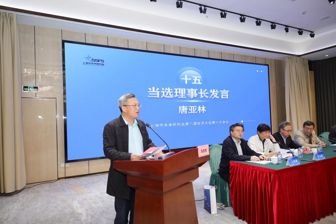 在当选理事长发言环节,唐亚林首先感谢会员和理事们的信任,以及一代又一代的上海未来研究会的会员与前辈们将研究会发扬光大,成为众多研究会、学会的一大中坚,并感谢前任理事长杨存忠教授在过去十年卓有成效的领导工作以及第六届、第七届理事会的共同努力,让上海市未来研究会在生存艰难、发展困难、创新磨难的情形下重新走上健康的发展道路。其次,唐亚林重点阐述了未来研究会应该重点关注什么、会员能够做些什么等内容,提出了四点未来研究会所能做的工作。一是充分发挥各方面代表的力量,发挥统筹协调和整体攻坚作用;二是根据未来研究会的未来重点,适当成立相应的专委会,在相关前沿、基础和专业领域持续发声和持续发挥作用;三是要加强研究会的日常交流、学习和调研工作,“结交新朋友,不忘老朋友”,让所有会员在未来研究会共同体中共同成长、共同提高、共同发展;四是加强研究会党的建设,坚持党的全面领导,切实做好理事会党的工作小组工作,实施“党建强会计划”,促进党建和业务工作深度融合。