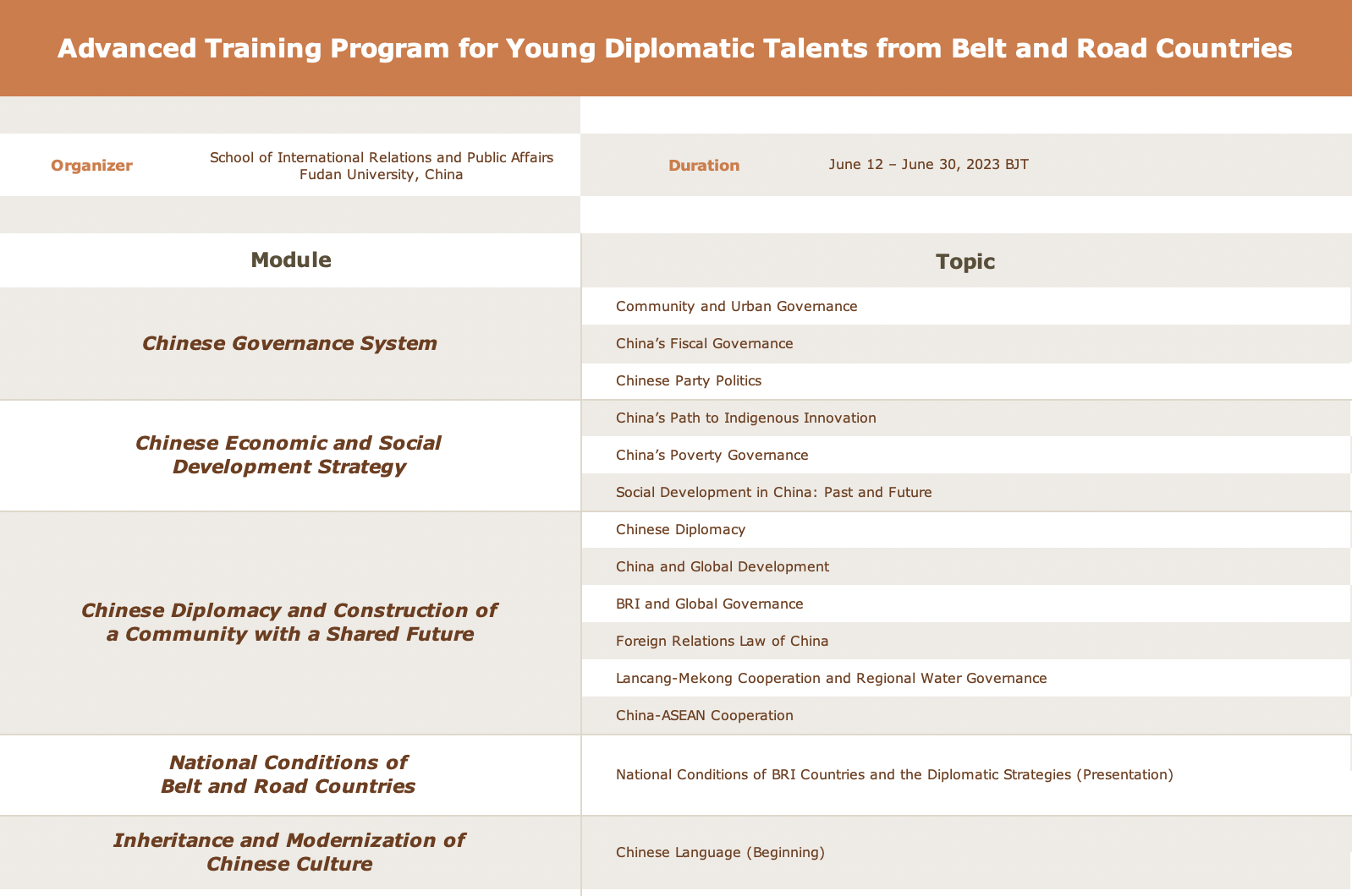Advanced Training Program for Young Diplomatic Talents from Belt and Road Countries (the“Program”) is sponsored by Shanghai Municipal Education Commission and organized by School of International Relations and Public Affairs (“SIRPA”), Fudan University.