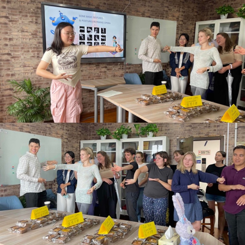为了更好地让留学生们体会到中华传统文化的魅力,王苾也同学还为大家表演了经典京剧曲目《贵妃醉酒》,极富表现力的声腔深深感染了参加活动的留学生们,他们在欣赏的同时,不时发出赞叹和感慨,并跟随王苾也同学认真学习和比划京剧中的经典手势——云手。