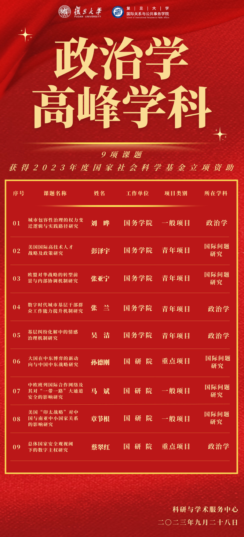 2023年国家社科基金年度项目和青年项目按照规定程序,顺利完成评审立项工作并向社会公布。复旦大学政治学高峰学科有9项科研项目入选,包括2项重点项目、3项一般项目、4项青年项目,具体情况如下: