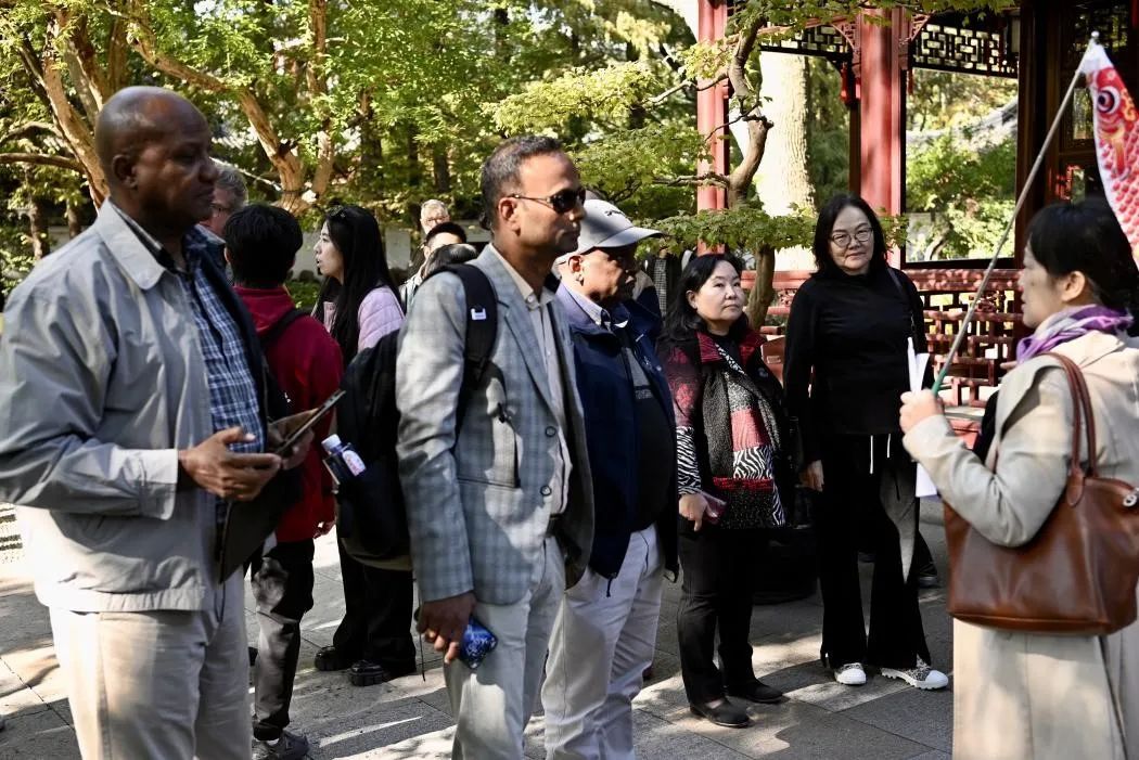 上午9时,各国嘉宾一同前往江南古典园林代表——豫园。在导游和学生志愿者们的讲解下,各国嘉宾了解了豫园的历史脉络,领略了中国传统美学智慧。漫步园内,楼阁参差,山石峥嵘,湖光潋滟。各国嘉宾赞叹不已,纷纷合影留念,现场气氛融洽。