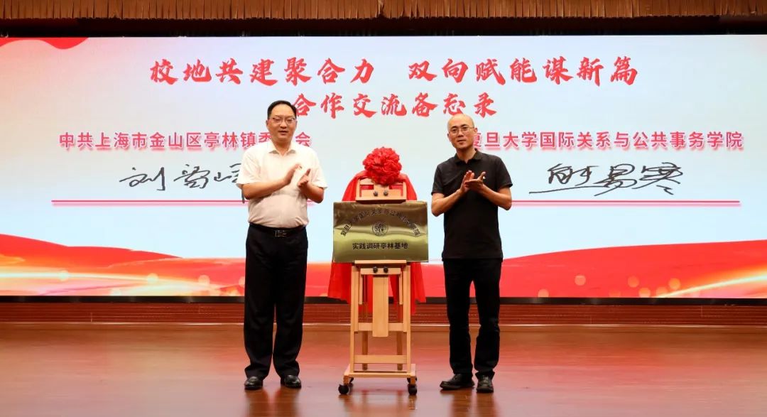 亭林镇党委书记刘雪峰与熊易寒共同签署校地合作交流备忘录,为bet365体育-bet365中文版app 实践调研亭林基地揭牌。