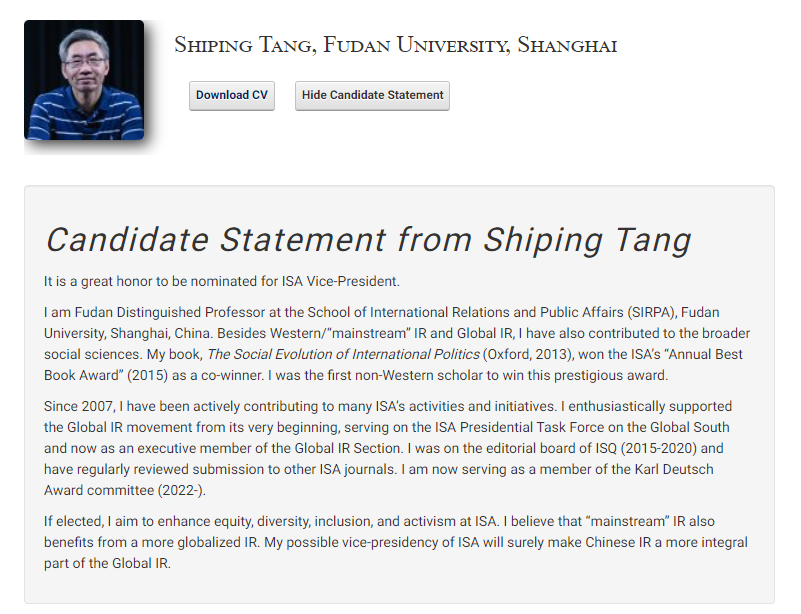 唐世平教授成功当选为 ISA 的副主席,体现了 ISA 全球会员对唐世平教授学术贡献的高度肯定,也是对他长期致力于推动“全球国际关系(Global IR)”,以及为 ISA 和更大的国际关系领域多年的公共服务的广泛认可。