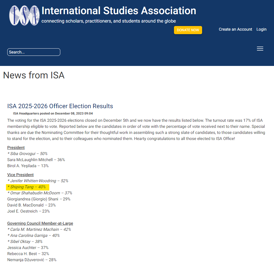 国际研究协会(ISA,International Studies Association)的2025—2026届选举投票于12月5日落下帷幕。2023年12月8日,ISA 公布了选举结果。唐世平教授从6位副主席候选人中脱颖而出,以40%的高得票率成功当选 ISA 的3位副主席(Vice President)之一,任期一年(2025—2026)。