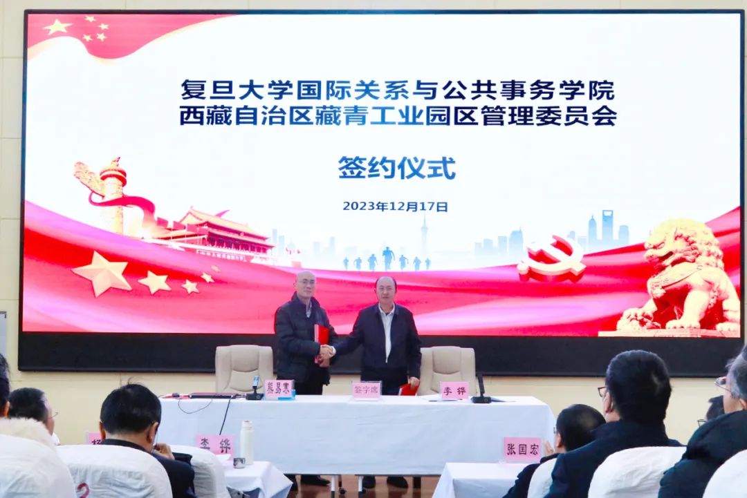 2023年12月17日,在西藏自治区藏青工业园区管委会主任张国宏等领导的见证下,bet365体育 副院长熊易寒与藏青工业园区管委会副主任李铧签署合作备忘录。该合作旨在深化对西藏工作的规律性认识,总结党领导人民治藏稳藏兴藏的成功经验,助力西藏自治区藏青工业园区实现高质量发展与高水平治理,推进复旦大学政治学、公共管理等学科建设。双方将合作开展边疆地区经济社会治理领域的课题研究;建立党建共建基地和教学实习基地,为复旦大学政治学、国际关系、公共管理等专业的学生提供实践锻炼和学习机会;每年推荐优秀博士生到藏青工业园区管委会及下属单位挂职;定期组织公共管理专业硕士项目(MPA)学生到藏青工业园区开展学习实践与社会调研活动;合作共建边疆经济社会治理案例库。